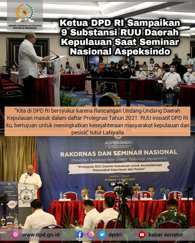 “Kita di DPD RI bersyukur karena Rancangan Undang-Undang Daerah Kepulauan masuk dalam daftar Prolegnas Tahun 2021. RUU inisiatif DPD RI itu, bertujuan untuk meningkatkan kesejahteraan masyarakat kepulauan dan pesisir,” tutur LaNyalla.