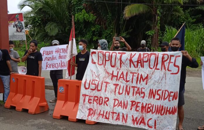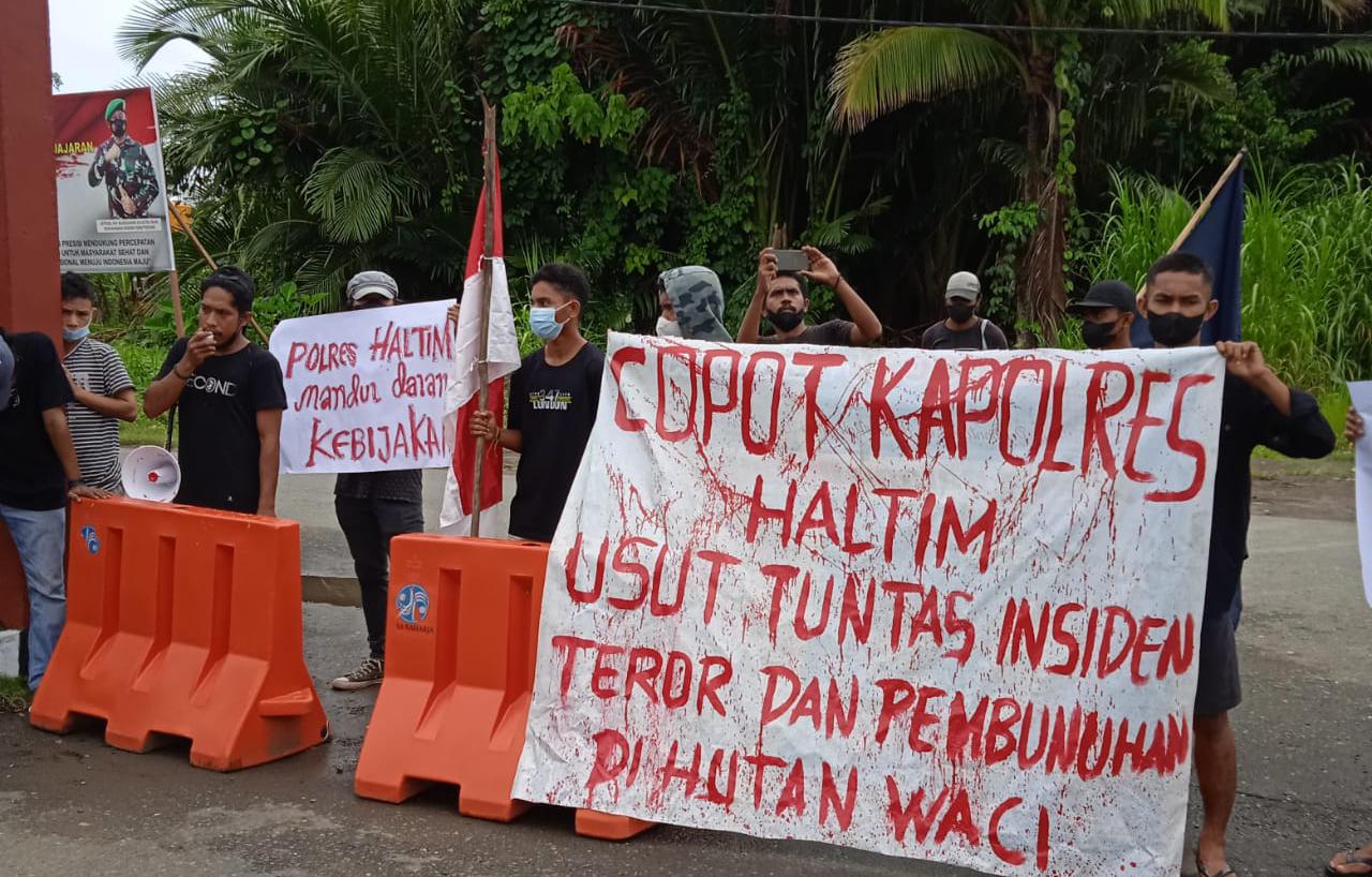 Aksi yang dilakukan di depan kantor polres Haltim itu menuntut pihak Kepolisian dalam hal ini Polres Haltim, agar segera menagkap dan mengadili 8 pelaku yang tercatat sebagai Daftar Pencarian Orang (DPO), atas kasus pembunuhan di kali Waci Kecamatan Maba Selatan Halmahera Timur, pada beberapa waktu yang lalu.