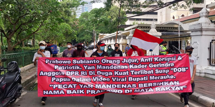 JAKARTA, JAGAMELANESIA.COM – Kaukus Pemuda Anti Korupsi (KAPAK) mendatangi gedung Kementerian Pertahanan Republik Indonesia (Kemenhan RI) untuk menyuarakan tuntutan kepada Prabowo Subianto agar memecat kader Gerindra yakni anggota DPR RI dapil Papua, Yan Mandenas. Tuntutan itu berkaitan dengan dugaan keterlibatan Yan Mandenas atas pengesahan DOB di Papua.