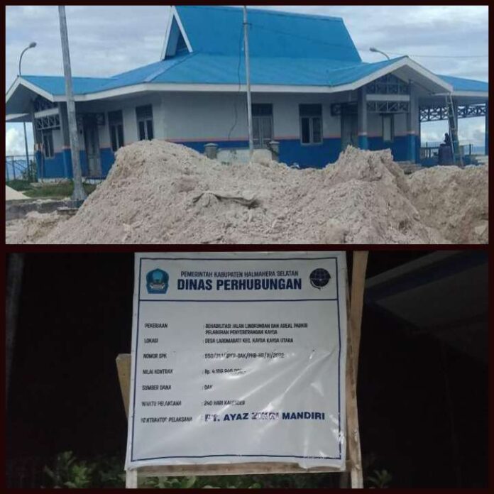 MALUKU UTARA – Pekerjaan proyek pembangunan Rehabilitasi Jalan Lingkungan dan Areal Parkir Pelabuhan Penyeberangan Kayoa, yang berlokasi di Desa Laromabati, Kecamatan Kayoa Utara, Kabupaten Halmahera Selatan (Halsel), Provinsi Maluku Utara (Malut) meninggalkan sejumlah persoalan.
