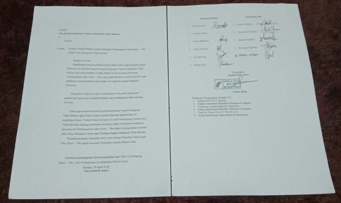 Surat tersebut berisi permintaan masyarakat kepada Kejaksaan Negeri Bintuni untuk menyelesaikan kasus tindak pidana korupsi pembangunan jalan Simei-Obo bersumber APBD tahun 2022.