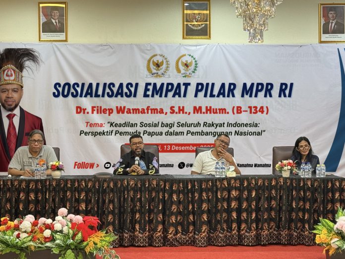 Manokwari — Anggota Dewan Perwakilan Daerah Republik Indonesia (DPD RI) asal Papua Barat, Dr. Filep Wamafma, S.H., M.Hum., menggelar kegiatan Sosialisasi Empat Pilar MPR RI pada Sabtu, 13 Desember 2025, bertempat di Aula Kampus Sekolah Tinggi Ilmu Hukum (STIH) Manokwari.